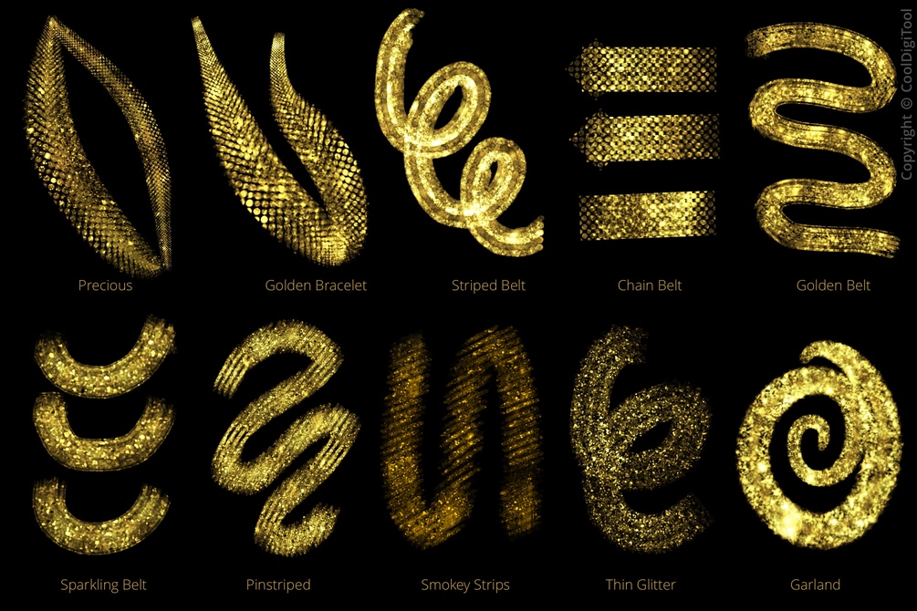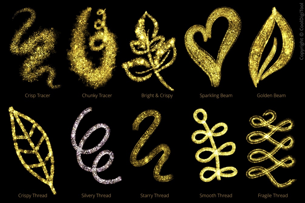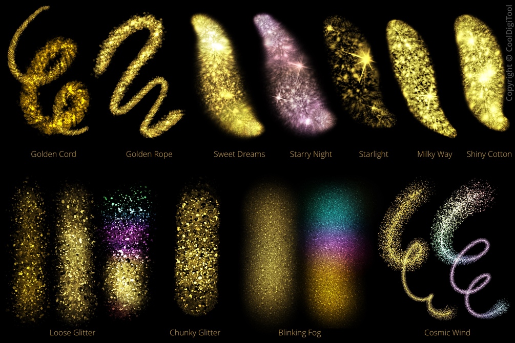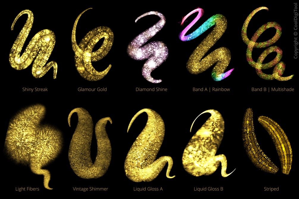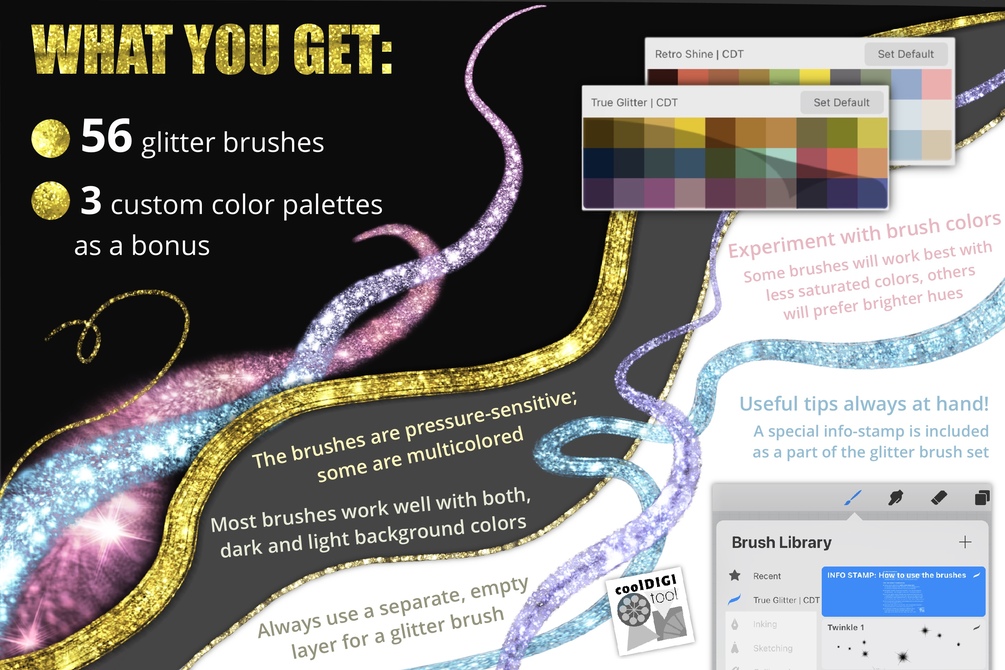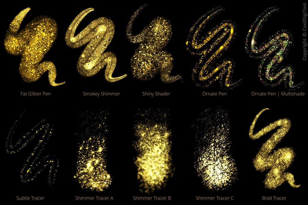 Most of the brushes are pressure-sensitive and work well with both, dark and light background colors. Some glitter brushes are additionally multicolor.