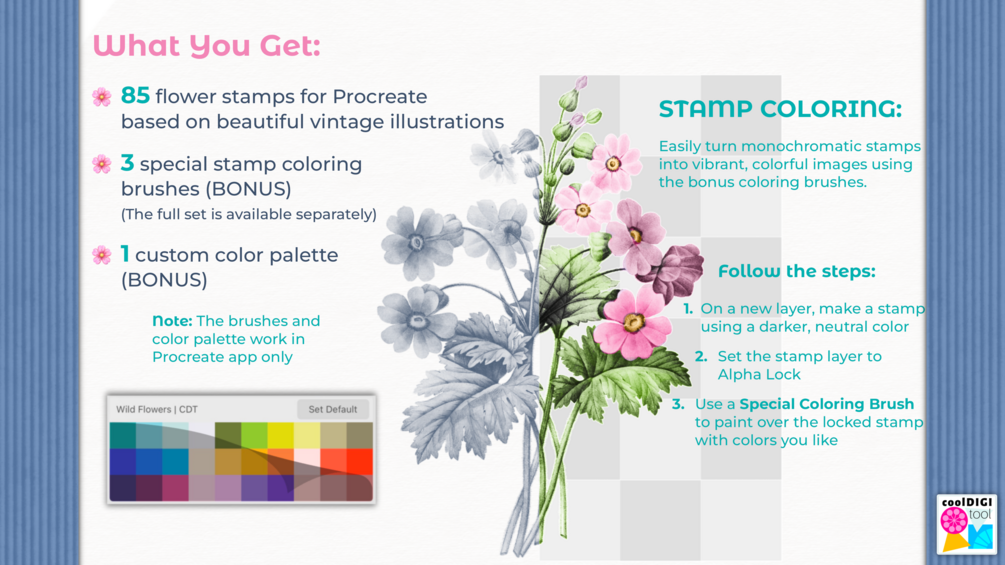 Vintage Flower Procreate Stamps Vol. 2 | With 85 Wildflower Motifs, Bonus Coloring Brushes & Custom Palette