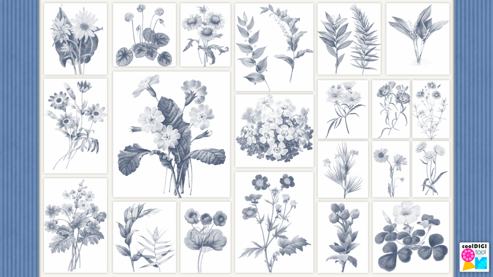 The floral motifs have been carefully isolated from high-quality public domain illustrations, digitally enhanced, and transformed into Procreate stamp brushes.